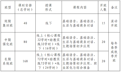 总学时:168学时。构成如下:线下课程:24学时(阶段性集中面授)、线上远程课程:72学时(深度语言文化、行业专题课程)、线上助教实践:72学时(高频次实战演练、个性化辅导)。