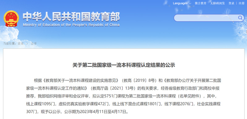 日前,《关于第二批国家级一流本科课程认定结果的公示》发布,我校课程《大学英语(三)》入选线上线下混合式一流课程。这是我校《大学英语:英语语言技能提高方法》获批首批国家级线上一流课程后《大学英语》再次获批国家级一流本科课程。