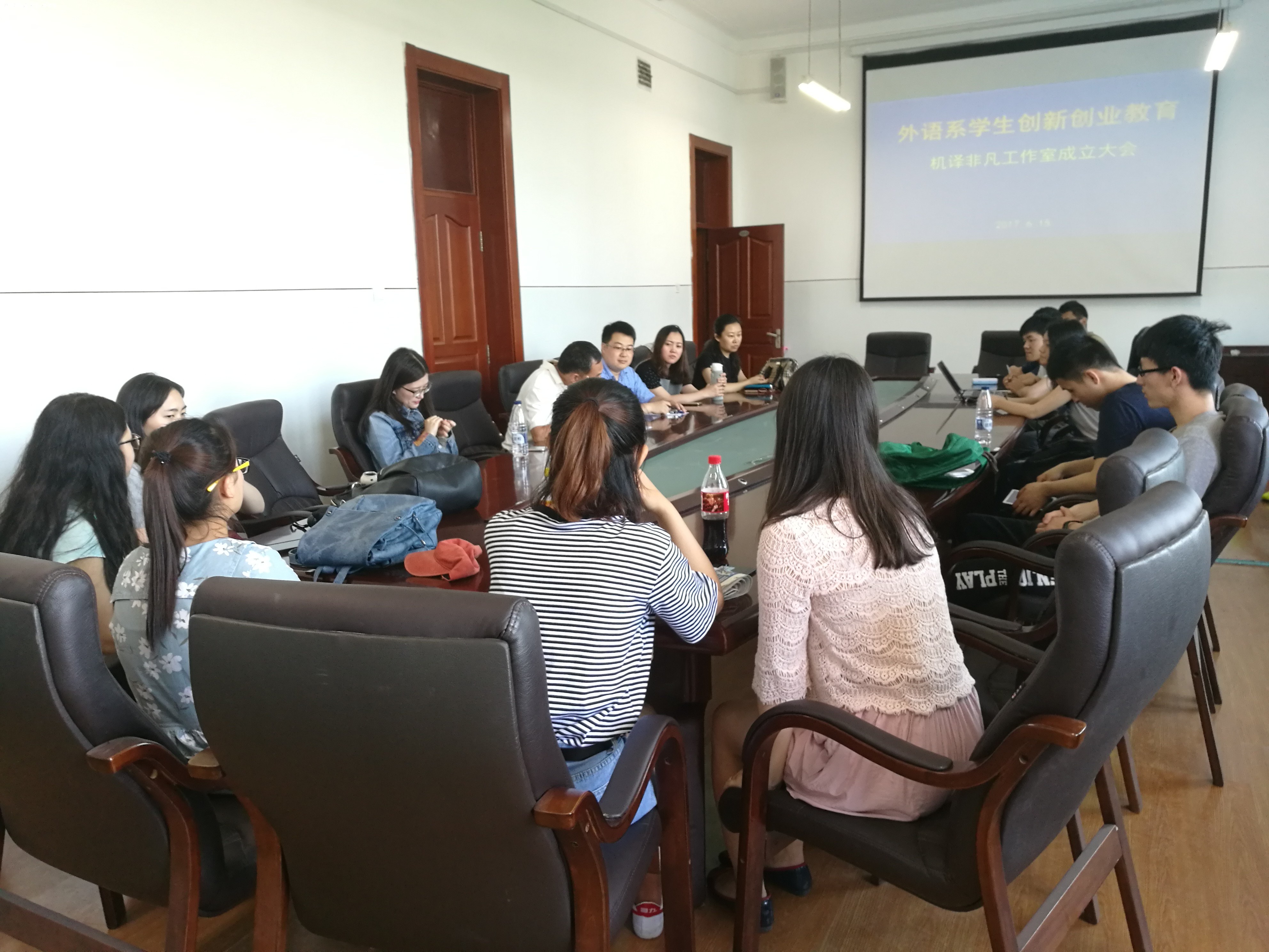 6月15日中午12时30分,外语系创新创业教育团队――“机译非凡工作室”启动大会在41号楼417室举行。“机译非凡工作室”指导教师周伟、张冰、沈思、刘雯,以及学生团队所有成员参加会议。会议由外语系辅导员由春桥主持。